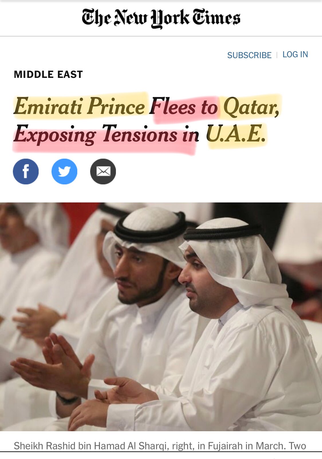 Ahmad Alyehri A Twitteren نيويورك تايمز إنشقاق الشيخ راشد بن حمد الشرقي نجل حاكم الفجيرة ولجوءه إلى قطر يعطي لمحة عن التوترات الحالية بين حكام الإمارات Https T Co Kbaypwycyk